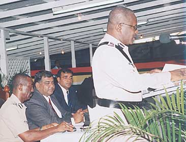 POLICE Commissioner Winston Felix delivering his opening remarks. Home Affairs Ronald Gajraj and President Bharrat Jagdeo.