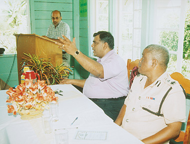 Minister Ronald Gajraj making a point during yesterday's meeting at the Cove and John Police Station.